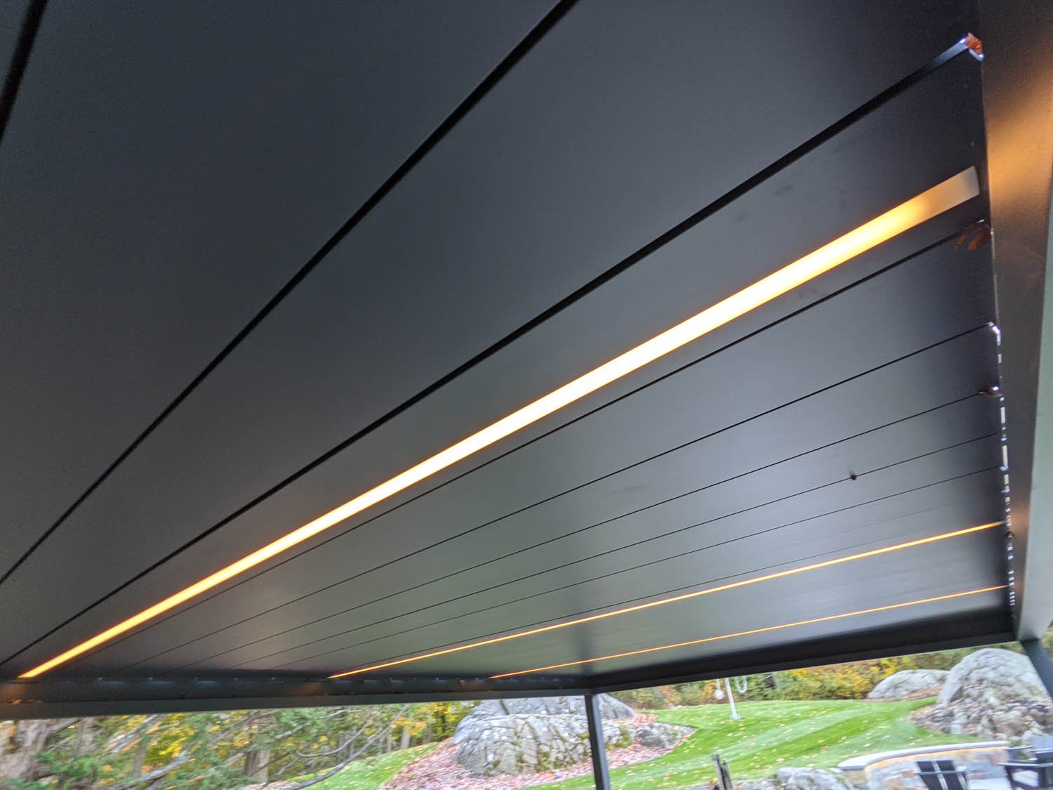 This modern landscape seamlessly blends nature and architecture. A motorized, louvered pergola with integrated LED lighting shelters an irregular stone dining terrace. Nearby, broad radial steps lead to a raised firepit, while striking sculptures, native ledge outcroppings, and ornamental grasses complete this sophisticated outdoor living space.